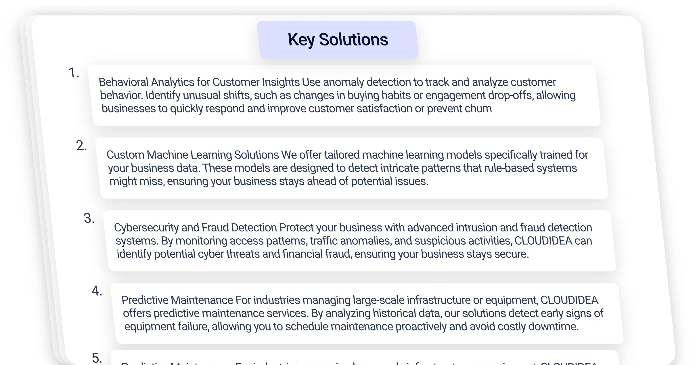 - Custom Machine Learning Solutions We offer tailored machine learning models specifically trained for your business data. These models are designed to detect intricate patterns that rule-based systems might miss, ensuring your business stays ahead of potential issues.