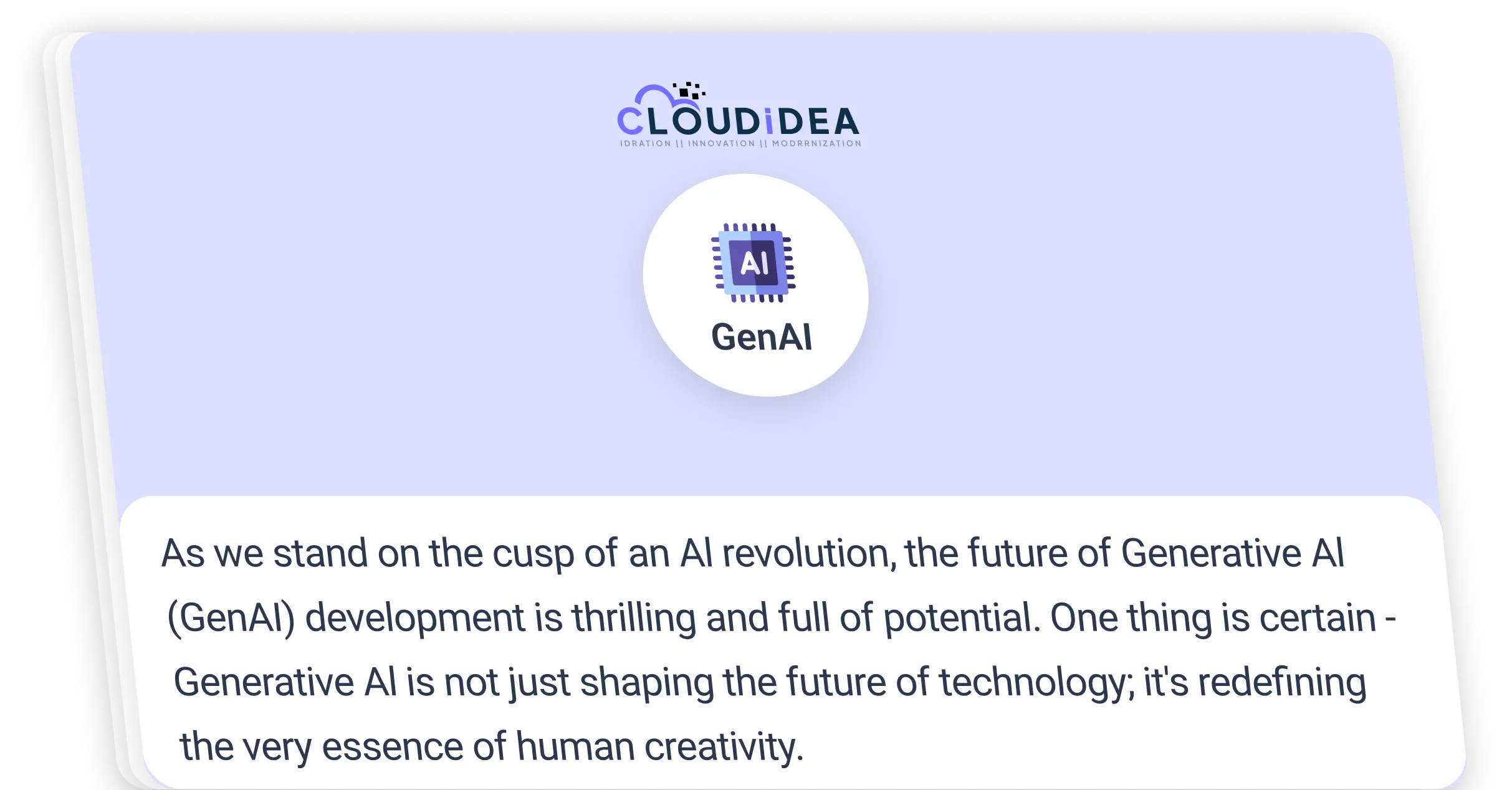 Generative Al has emerged as one of the most exciting fields in modern technology. Its impact is undeniable, from content creation to software development and healthcare to entertainment. CLOUDIDEA recognizes the responsibility that comes with this power. Our developers navigate the challenges of bias, ethics, and resource demands to ensure that GenAl serves as a force for good in the digital age.