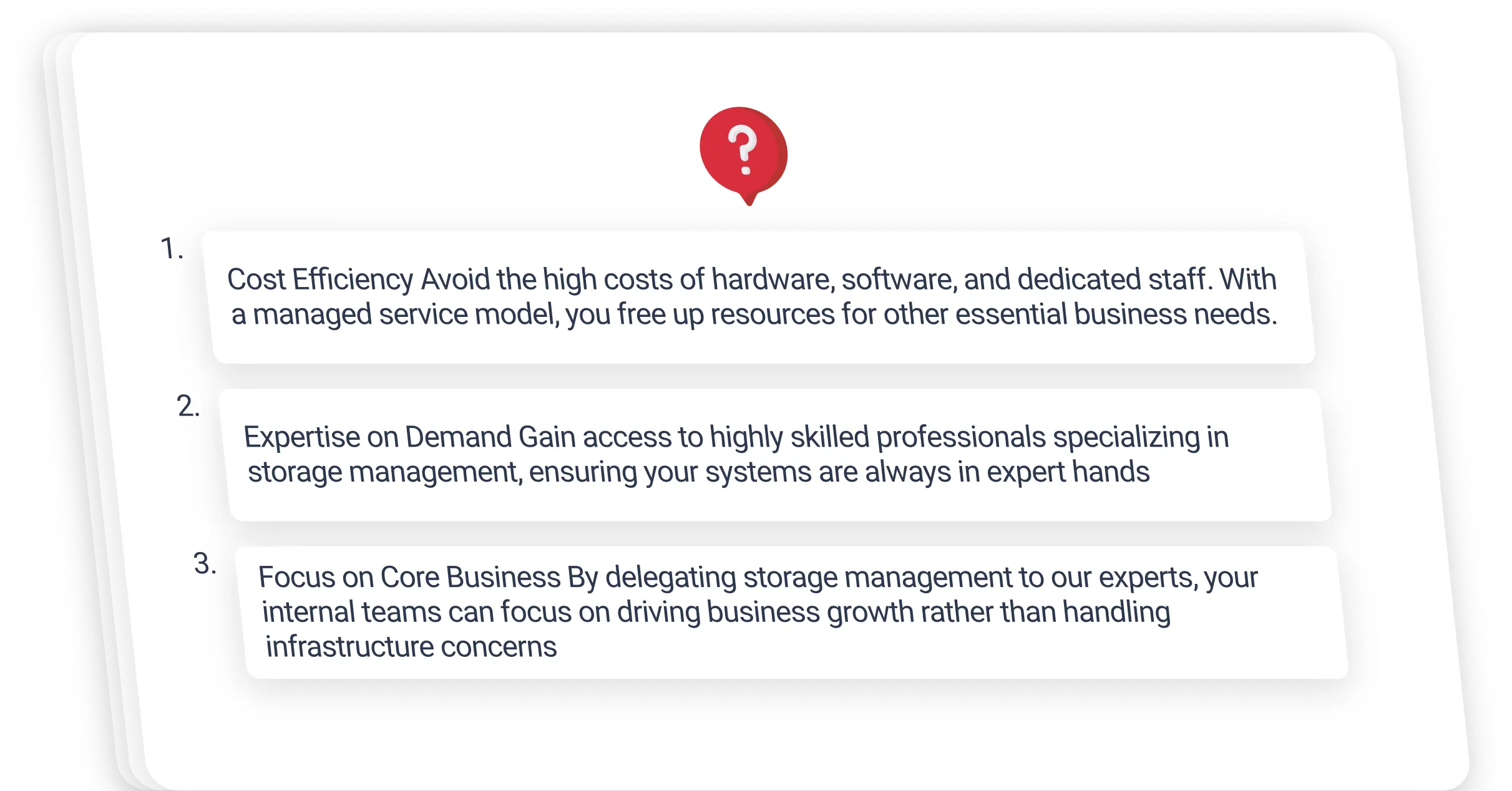 • Focus on Core Business By delegating storage management to our experts, your internal teams can focus on driving business growth rather than handling infrastructure concerns